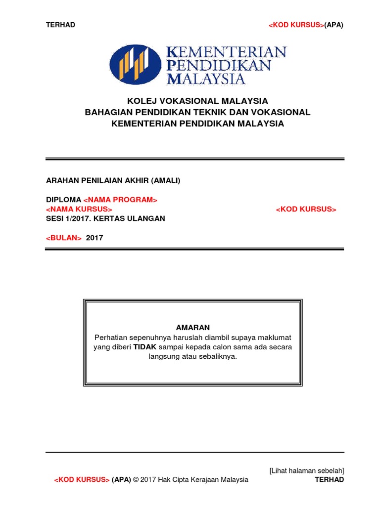 Kolej Vokasional Malaysia Bahagian Pendidikan Teknik Dan Vokasional Kementerian Pendidikan Malaysia