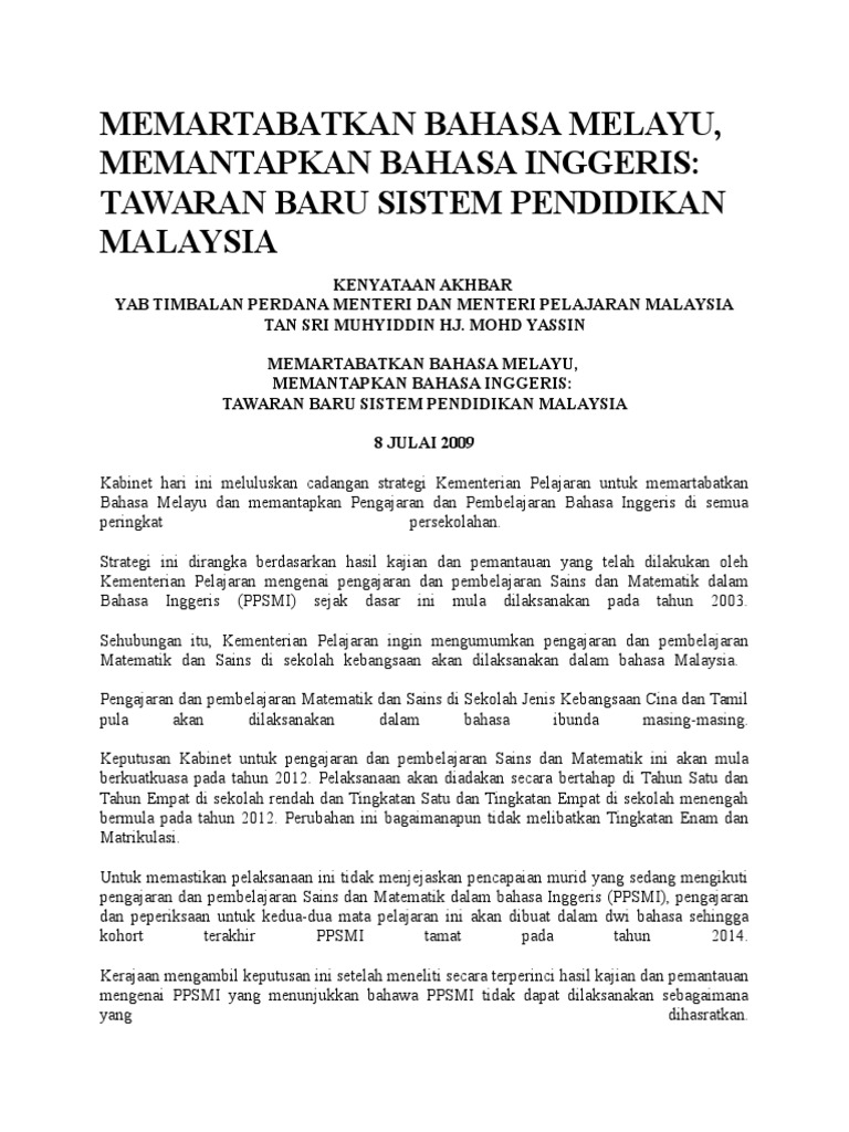 Memartabatkan Bahasa Melayu Memantapkan Bahasa Inggeris Tawaran Baru Sistem Pendidikan Malaysia