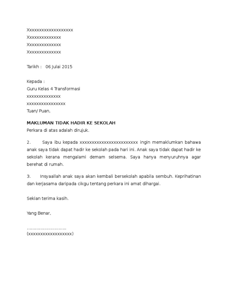 Contoh Surat Tidak Hadir Ke Sekolah Kerana Demam Kumpulan Surat Penting