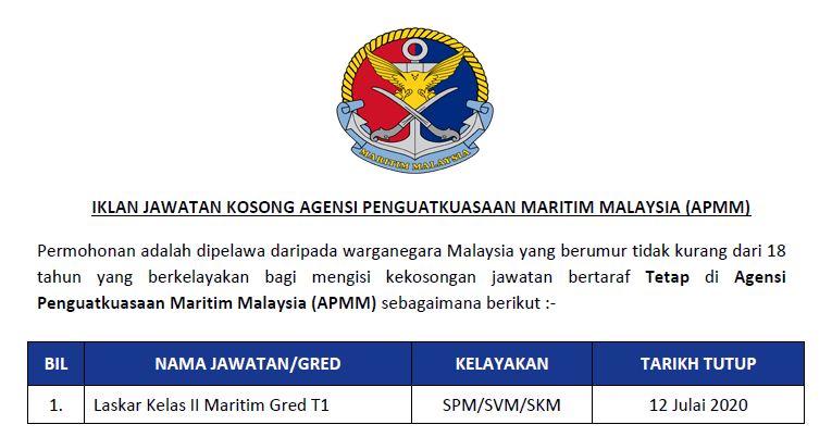 Jawatan Kosong Agensi Penguatkuasaan Maritim Malaysia Apmm Tarikh Tutup 12 Julai 2020