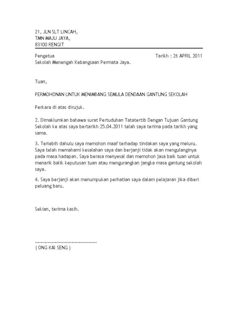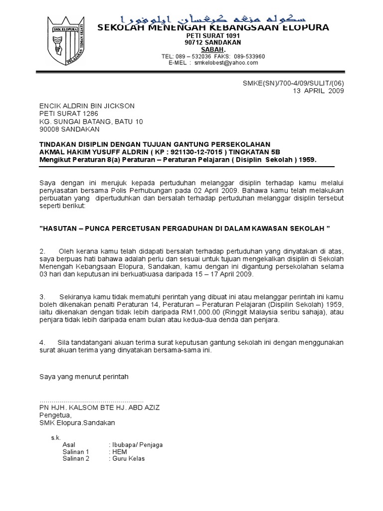 Contoh Surat Pertuduhan Untuk Tujuan Gantung Sekolah Sebagai Hukuman