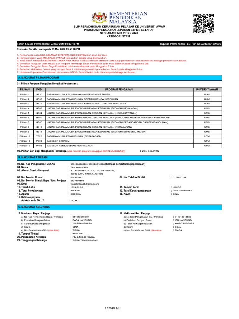 Slip Permohonan Kemasukan Pelajar Ke Universiti Awam Program Pengajian Lepasan Stpm Setaraf Sesi Akademik 2019 2020 Kategori Stpm