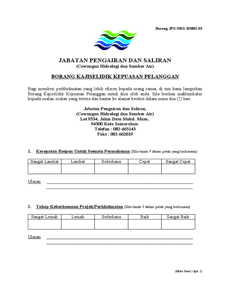 Jabatan Pengairan Dan Saliran Borang Kajiselidik Kepuasan Pelanggan