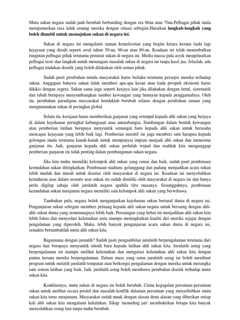 Di samping itu kemajuan sains dan teknologi hari ini juga wajar untuk diaplikasikan dalam sukan di negara kita. Oleh yang demikian hari sukan negara di jadikan agenda nasional yang selari dengan matlamat negara ke arah wawasan 2020. Peribahasa melayu jelas menyatakan bahawa tak basah dek hujan tak lekang dek panas. Contoh karangan kebaikan dan kepentingan aktiviti sukan kepada masyarakat dan negara.