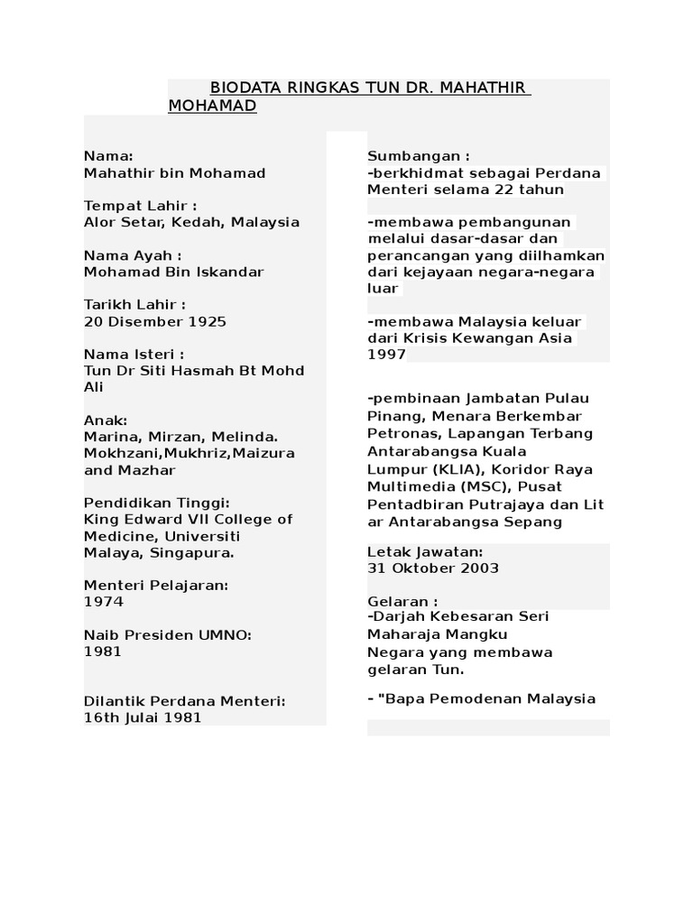 Mahathir mohamad biodata ringkas tun dr mahathir. Bagi mereka yang lahir pada tahun 90 an dan ke bawah pastinya ramai yang tahu lebih banyak tentang beliau. Putera kepada pasangan mohamad bin iskandar dan wan tempawan binti wan hanafi ini dilahirkan di rumah bernombor 18 lorong kilang ais bersebelahan dengan jalan pegawai seberang perak alor setar kedah. Istimewa untuk anda hari ini kami akan kongsikan nama serta sedikit biodata ringkas anak anak tun dr mahathir mohamad. Pasti ramai yang sudah kenal akan tun m yang pernah menjadi perdana menteri malaysia paling lama dalam sejarah negara.