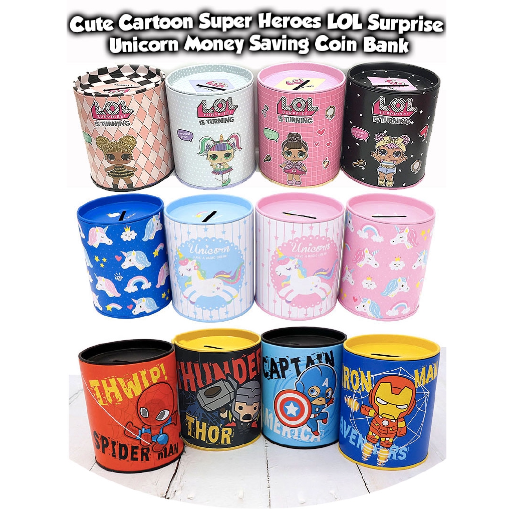 Cute Cartoon Super Heroes Lol Surprise Unicorn Money Saving Coin Bank Duit Tabung Tin Can For Boys Girls Kids Shopee Singapore